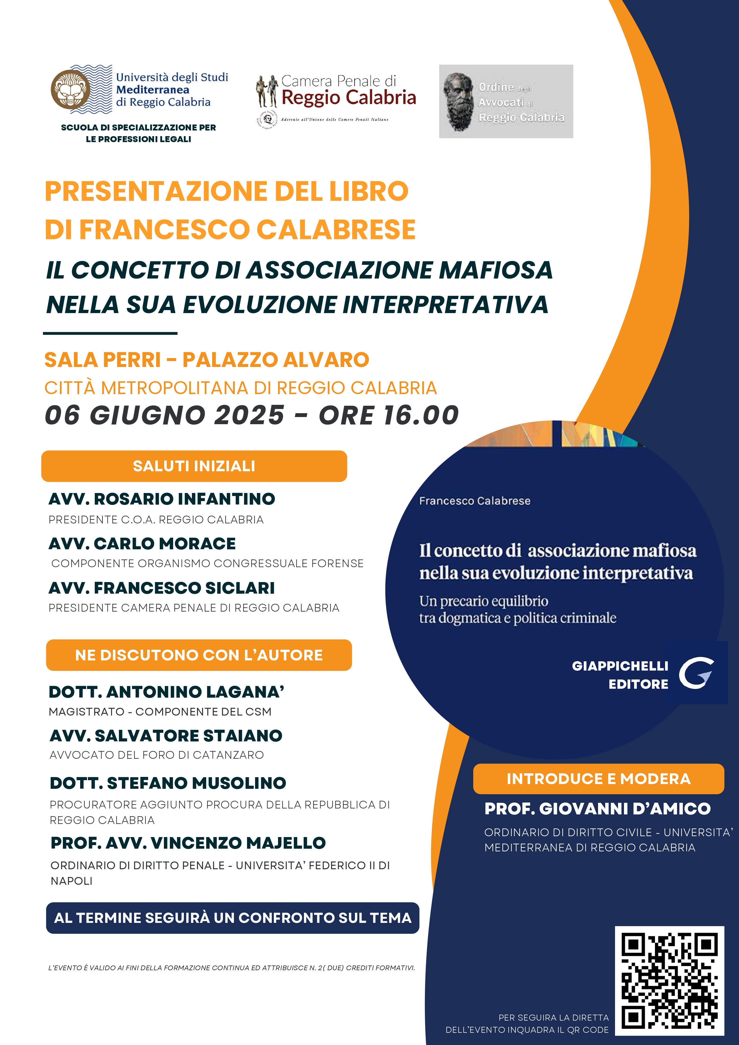 Venerdì 6 giugno 2025 si è tenuta la presentazione del volume "Il concetto di associazione mafiosa nella sua evoluzione interpretativa. Un precario equilibrio tra dogmatica e politica criminale" (Giappichelli Editore), un'analisi approfondita e attuale sul reato di associazione mafiosa.